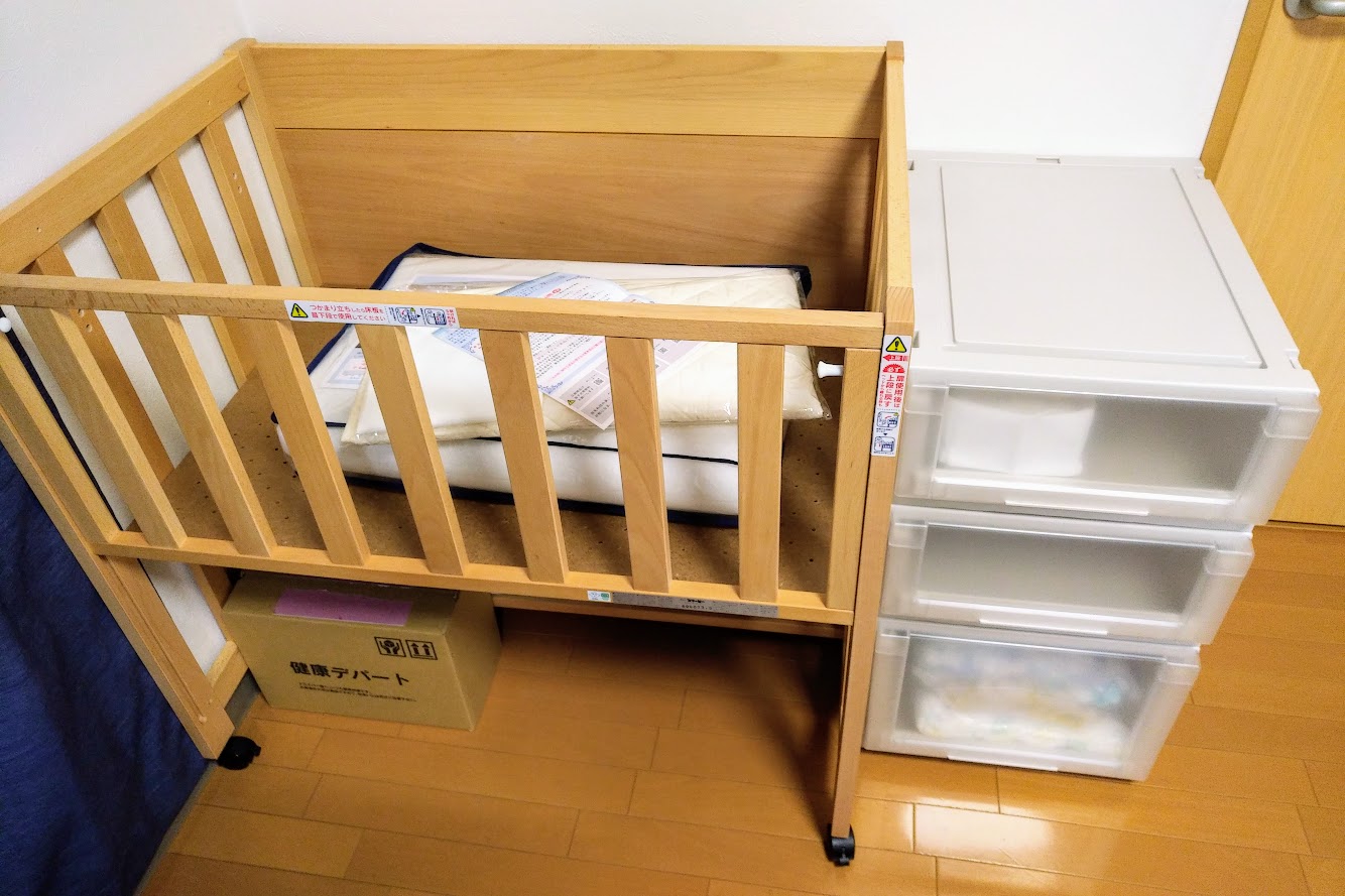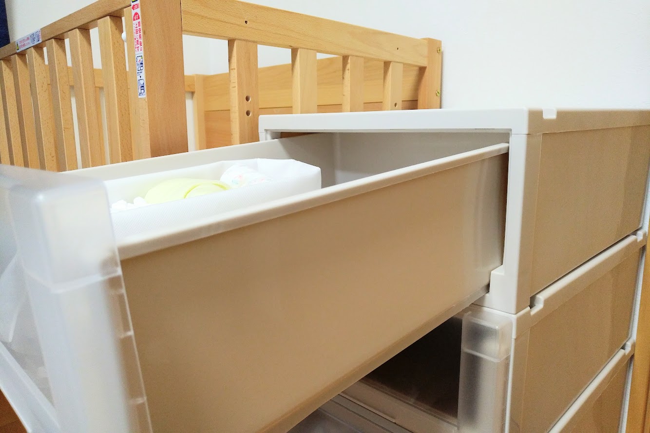 ベビーベッドの横に、赤ちゃんの衣類収納スペースを作りました。