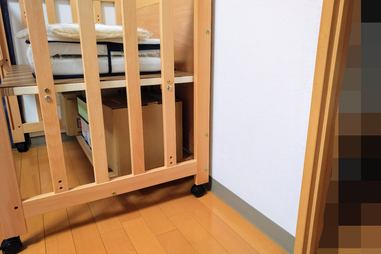引き出しを引っ張った時、必ずしもまっすぐ引けるわけではないので、ベビーベッドにピッタリ付けて設置するとベビーベッドにぶつかってしまう時があります。